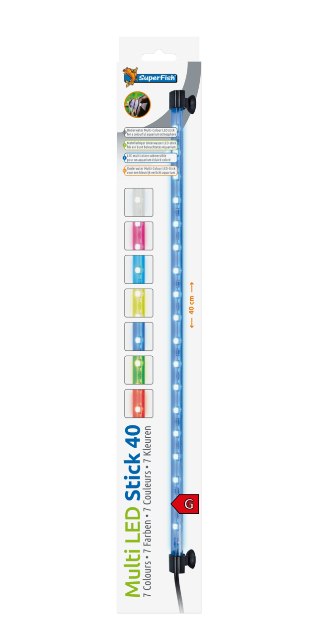 Der SuperFish Multi LED Stick ist eine kompakte, wasserdichte LED-Leuchte (IP68), erhältlich in 20 cm (2 W) und 40 cm (4 W). Sie bietet sieben Farben (rot, grün, blau, gelb, lila, hellblau, weiß) sowie einen automatischen Farbwechselmodus („Demo“). Dank der energiesparenden LEDs und komfortablen Saugnäpfen lässt sich der Stick flexibel einsetzen – über oder unter Wasser je nach Stimmung und Bedarf.