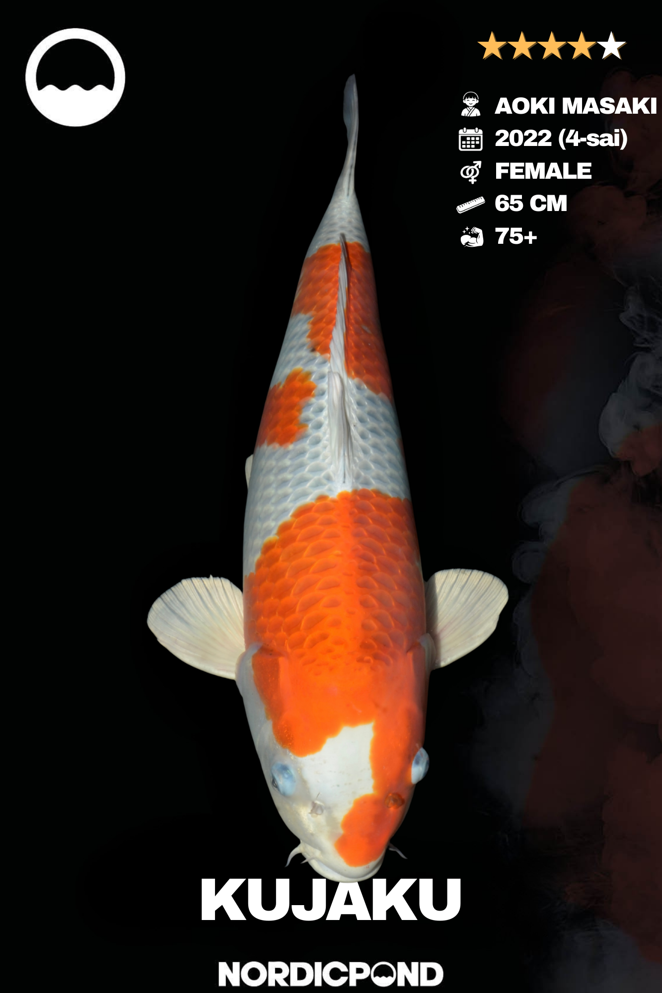 Dieser elegante Kujaku Koi aus der renommierten Aoki Masaki Koifarm in Japan besticht durch seine starke Farbwirkung und das charakteristische Kujaku-Schuppenbild. Der Koi stammt aus dem Jahrgang 2022 (Nisai) und misst aktuell 65 cm. Als weiblicher Koi besitzt er sehr gute Voraussetzungen für weiteres Wachstum und eine stabile Körperentwicklung.