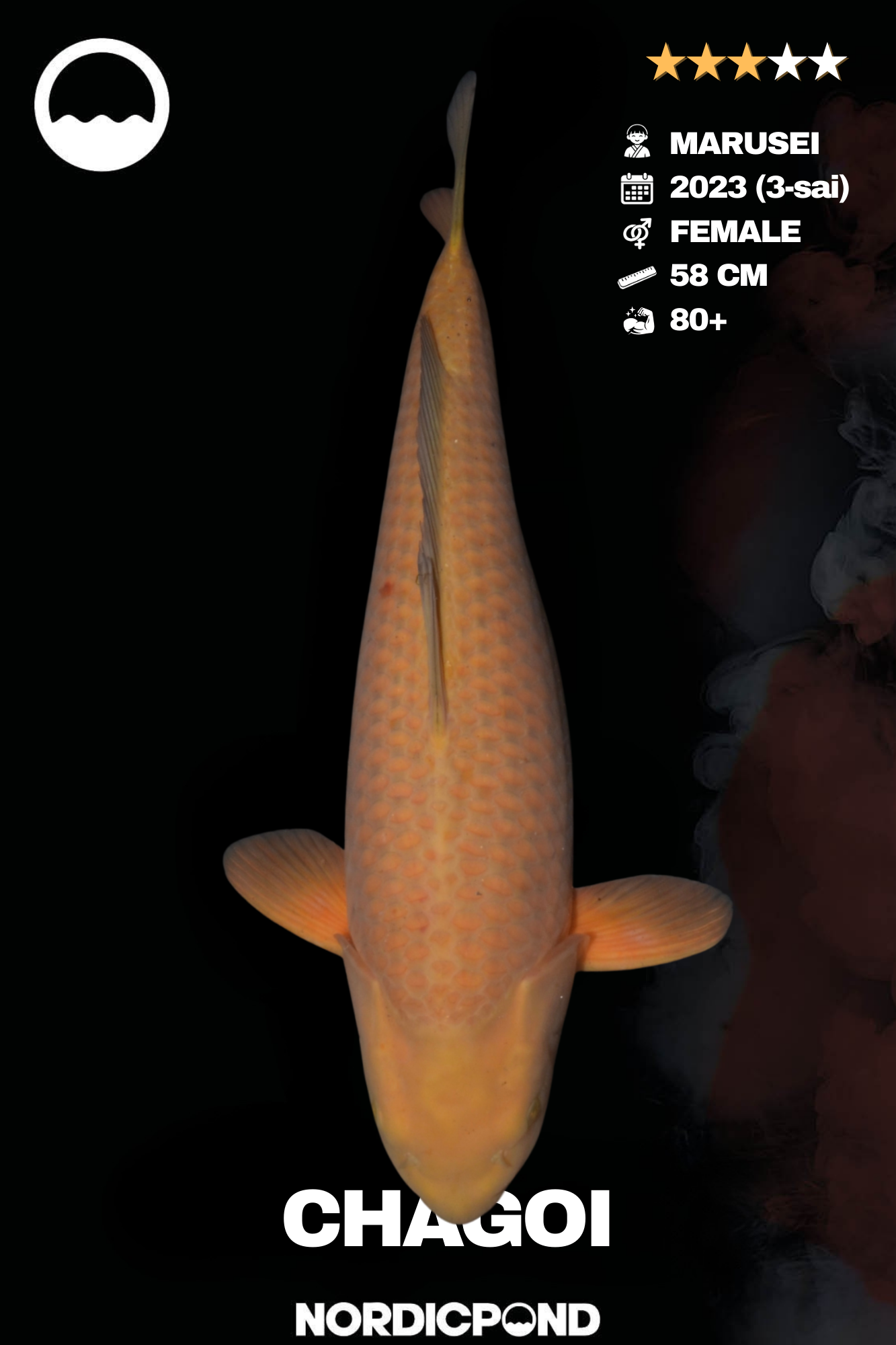 Hochwertiger Chagoi aus der bekannten Marusei Koifarm in Japan. Diese weibliche Koi-Dame aus dem Jahrgang 2023 misst aktuell 58 cm und überzeugt durch ihre ruhige Ausstrahlung und starke Wachstumslinie.