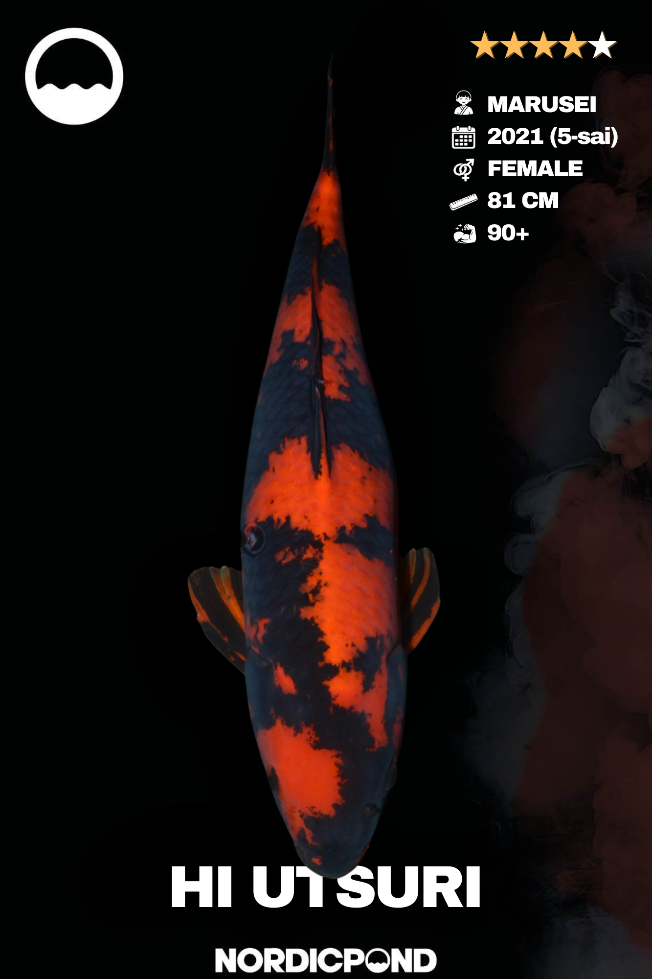 Dieser hochwertige Hi Utsuri aus der bekannten Marusei Koifarm in Japan überzeugt durch sein kraftvolles Farbspiel und eine beeindruckende Erscheinung im Koiteich. Der Koi stammt aus dem Jahrgang 2021 (Gosai) und misst aktuell 81 cm. Als weiblicher Koi besitzt er hervorragende Voraussetzungen für weiteres Wachstum und eine stabile Entwicklung.