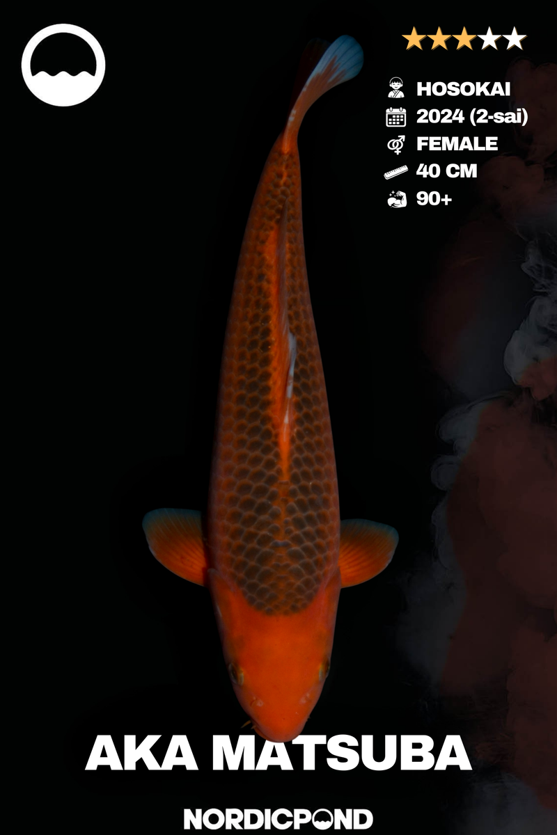 Hochklassiger Aka Matsuba von Hosokai, weiblich, 2-sai, 40 cm. Extrem sauberes Matsuba-Netz, kräftiges Beni und außergewöhnliche Klarheit – Top-Qualität mit 90+ Bewertung.