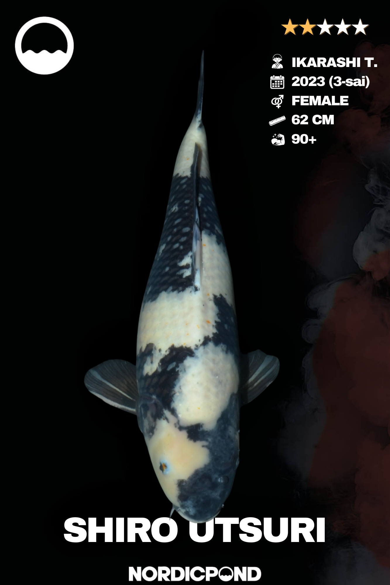 Die Ikarashi Koifarm ist international bekannt für hochwertige Utsuri-Linien mit ausgezeichneter Sumi-Entwicklung und starkem Wachstumspotenzial. Bei diesem Exemplar ist ein weiteres Wachstum in Richtung 90 cm+ realistisch.