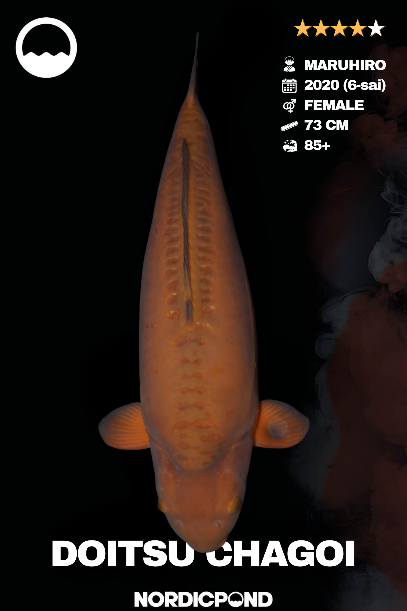 Dieser Doitsu Chagoi ist ein weiblicher 6-sai aus dem Jahr 2020. Die Doitsu-Haut zeigt eine gleichmäßige, matte Farbwirkung. Der Körperbau ist massiv und stabil. Ein typischer Chagoi mit ruhiger, souveräner Erscheinung.