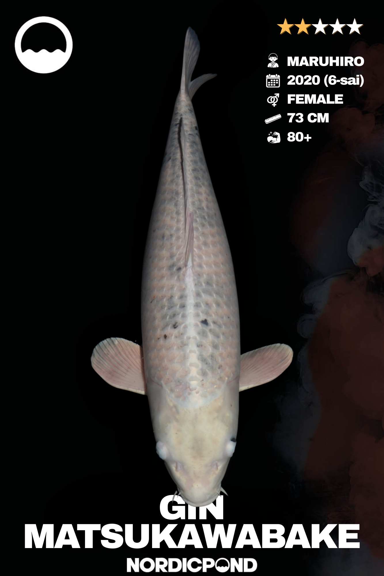 Dieser Gin Matsukawabake ist ein weiblicher 6-sai aus dem Jahr 2020. Die Farbwirkung ist ruhig und gleichmäßig mit feinem metallischem Glanz. Der Körper wirkt lang und ausgewogen. Ein reifer Koi mit zurückhaltender Eleganz.