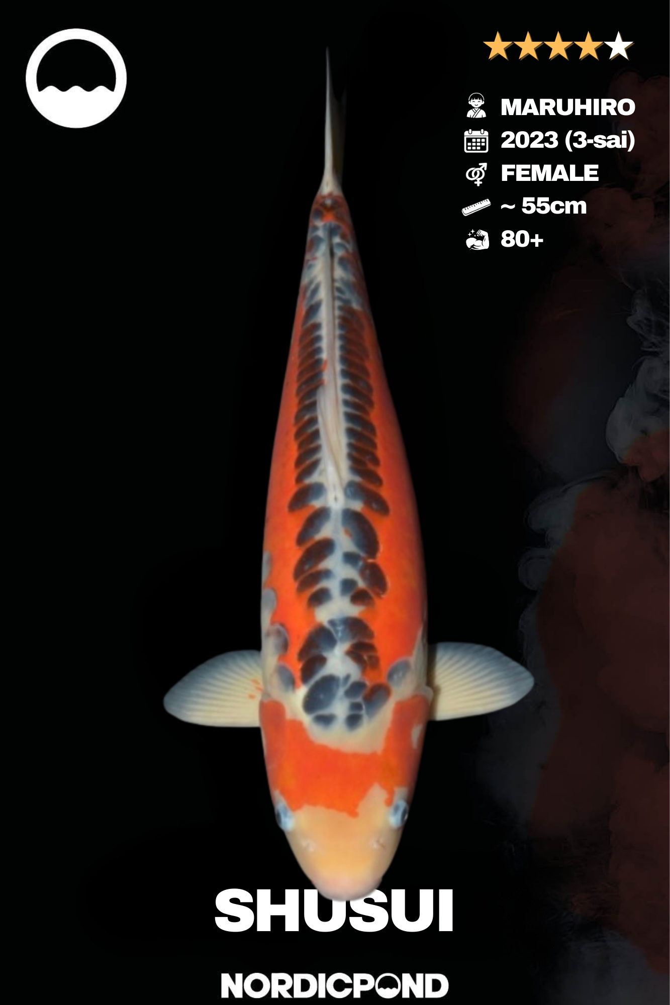 Dieser Shusui ist ein weiblicher 3-sai aus dem Jahr 2023. Die Rückenlinie zeigt eine klar ausgeprägte Doitsu-Schuppenreihe. Die Farbflächen sind kontrastreich und gut voneinander abgegrenzt. Ein typischer Shusui mit klarer Linienführung.