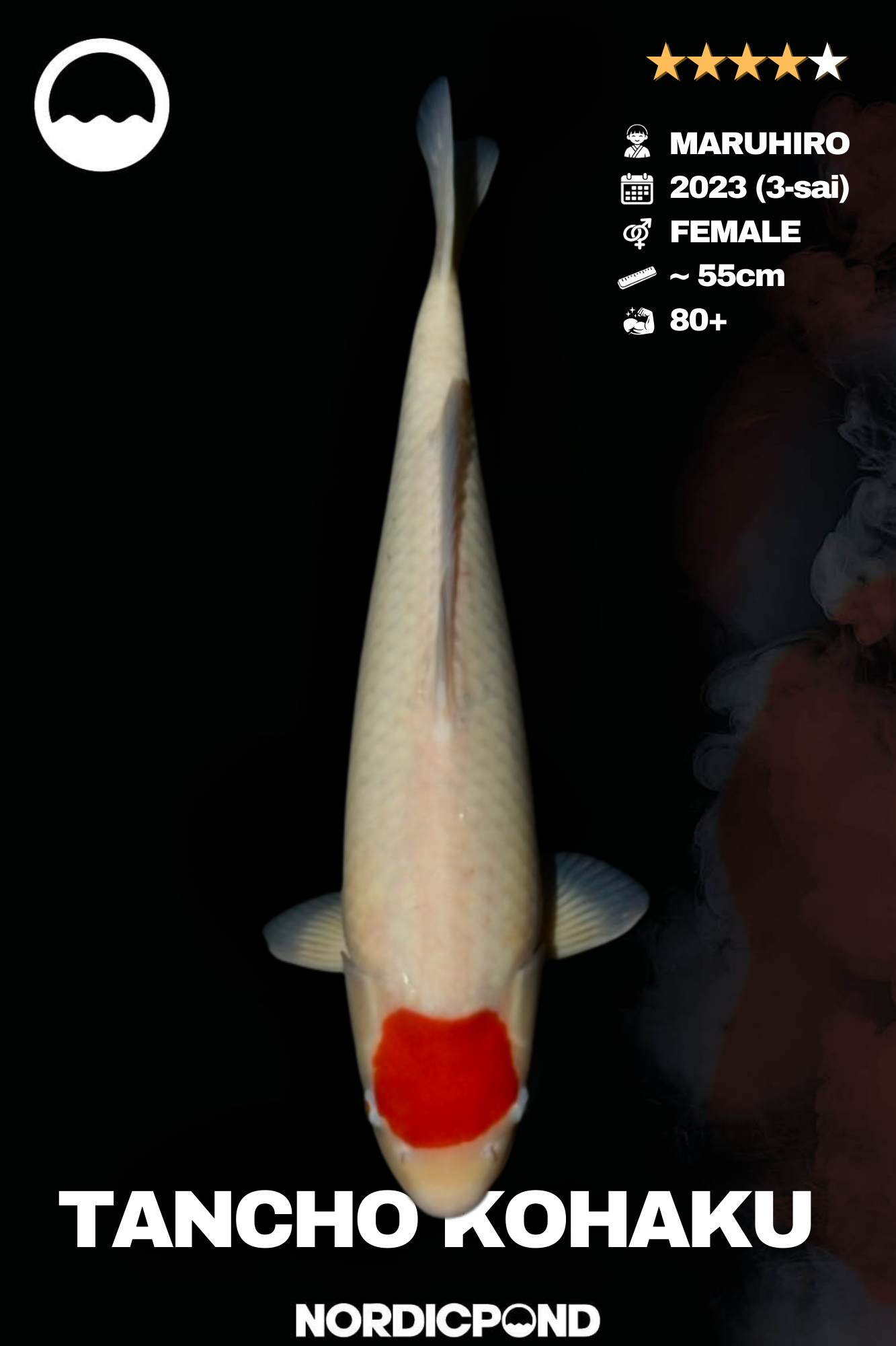 Tancho Kohaku von Maruhiro, Female, 3-sai (2023), ca. 55 cm. Klare Tancho-Zeichnung auf hellem Shiroji.