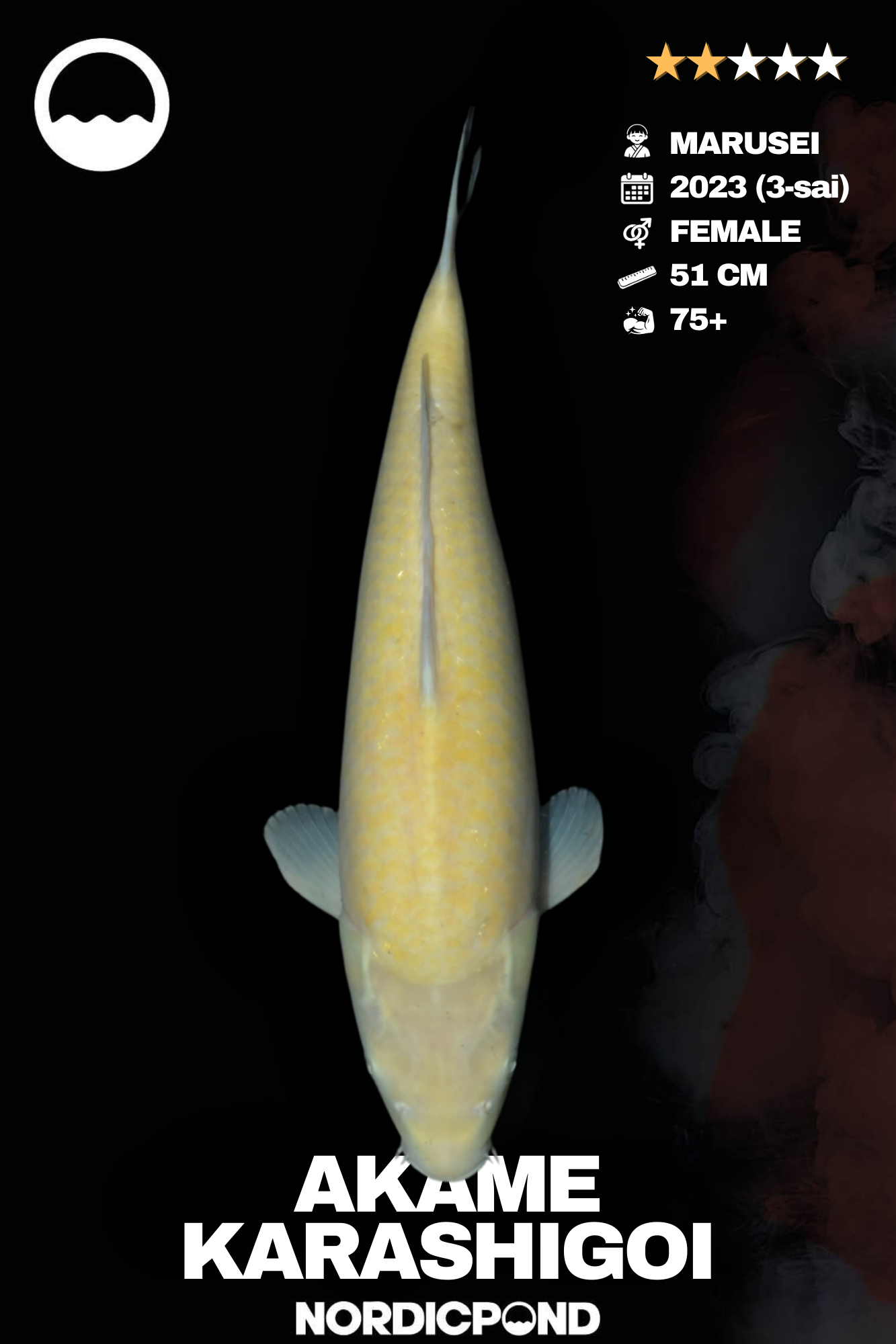 Mit einer aktuellen Größe von 51 cm und dem Alter 3-sai (Geburtsjahr 2023) zeigt diese weibliche Nishikigoi bereits eine kräftige Körperform und eine sehr gleichmäßige Entwicklung. Weibliche Koi entwickeln häufig ein stärkeres Körpervolumen, wodurch dieser Akame Karashigoi in den kommenden Jahren noch deutlich an Präsenz gewinnen kann.