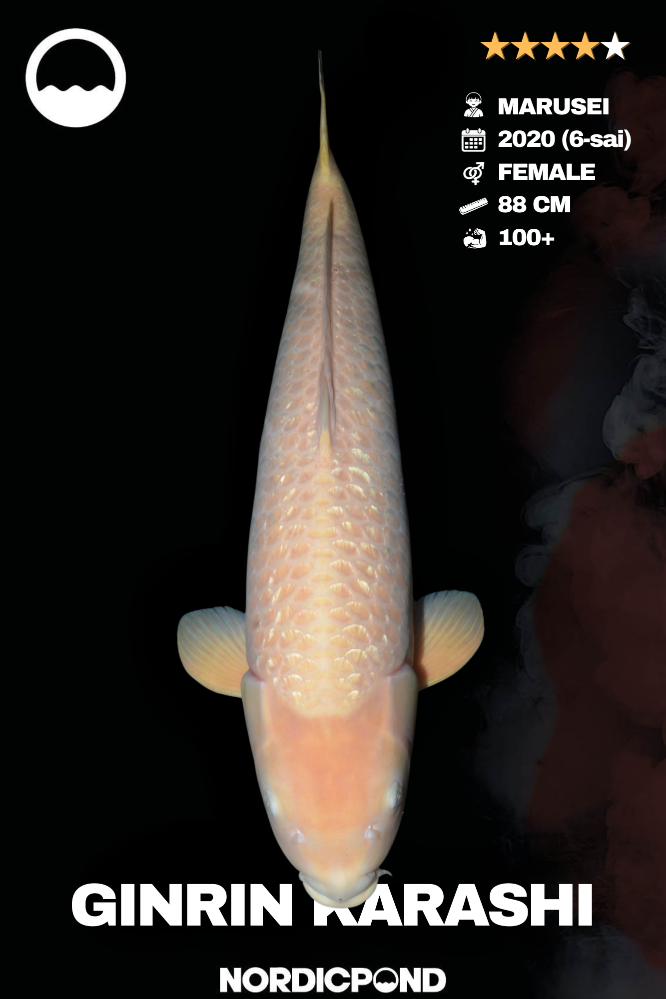 Dieser beeindruckende Ginrin Karashi Koi aus der bekannten Marusei Koifarm in Japan ist ein außergewöhnliches Exemplar mit beeindruckender Größe und Ausstrahlung. Der Koi stammt aus dem Jahrgang 2020 (Rokussai) und misst aktuell 88 cm. Als weiblicher Koi besitzt er hervorragende Voraussetzungen für weiteres Wachstum und eine stabile Entwicklung.