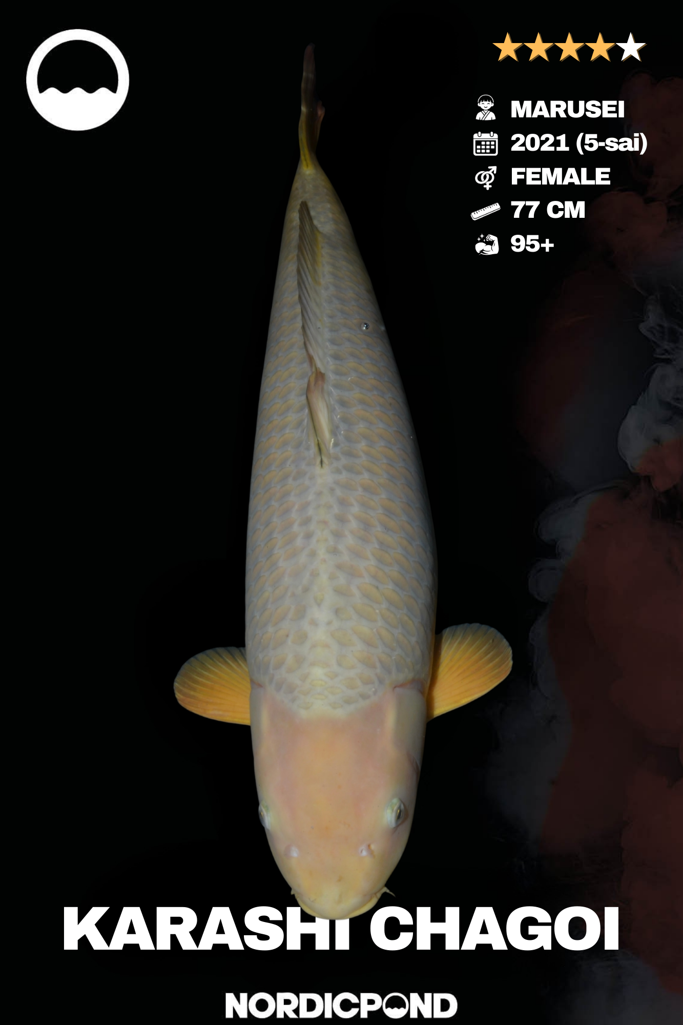 Imposanter Karashi Chagoi von der renommierten Marusei Koifarm aus Japan. Diese weibliche Gosai aus dem Jahrgang 2021 misst aktuell 77 cm und überzeugt durch ihre gleichmäßige Karashi-Färbung, eine sehr kräftige Körperstruktur und außergewöhnliches Wachstumspotenzial.