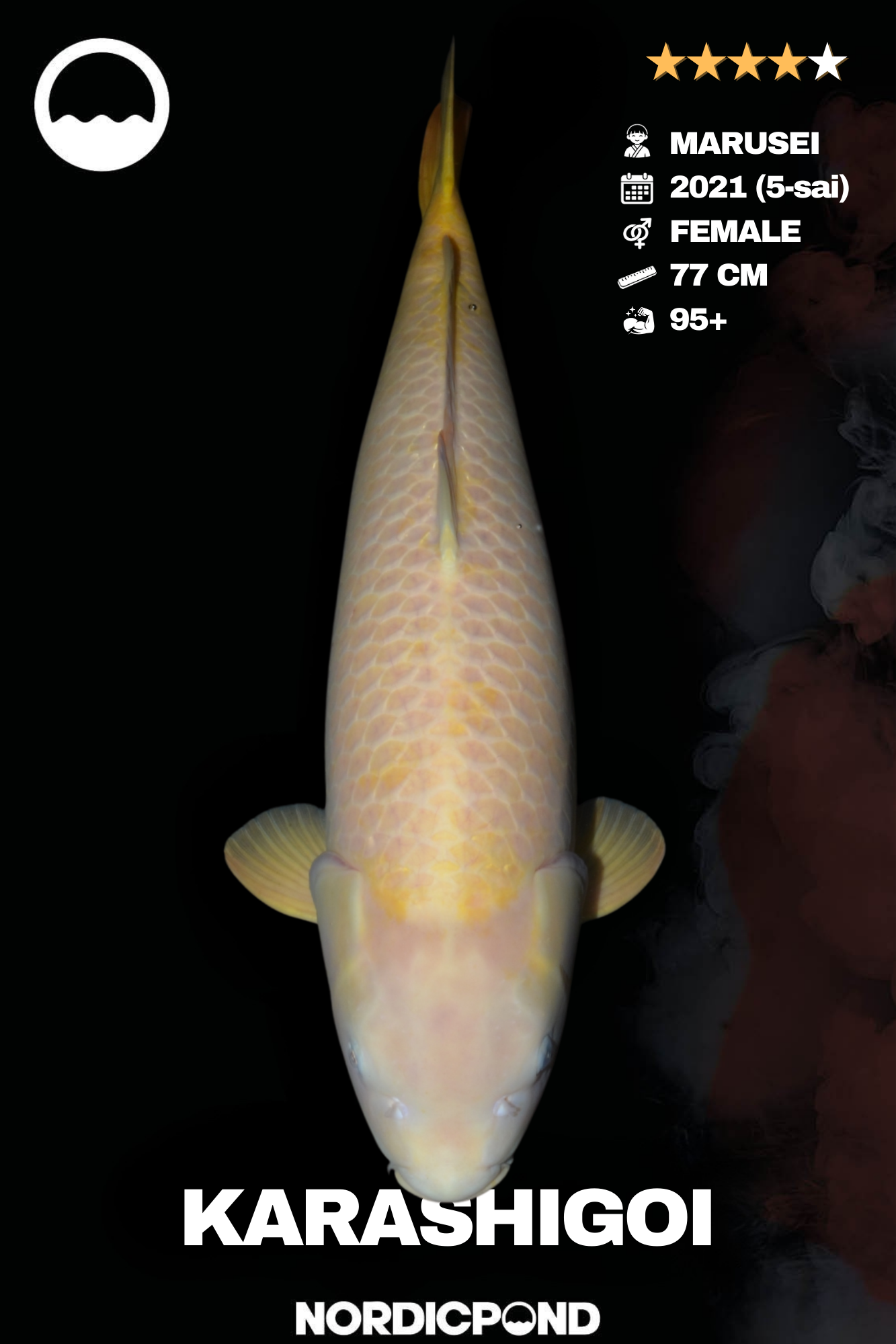 Karashigoi sind bekannt für ihre gleichmäßige gelbliche bis senffarbene Grundfarbe sowie ihre massive Körperstruktur. Besonders geschätzt wird diese Varietät für ihr ruhiges und zutrauliches Verhalten im Koiteich. Karashigoi gehören oft zu den ersten Koi, die Vertrauen zum Halter aufbauen und werden daher häufig zu echten „Leader-Fischen“ im Teich.
