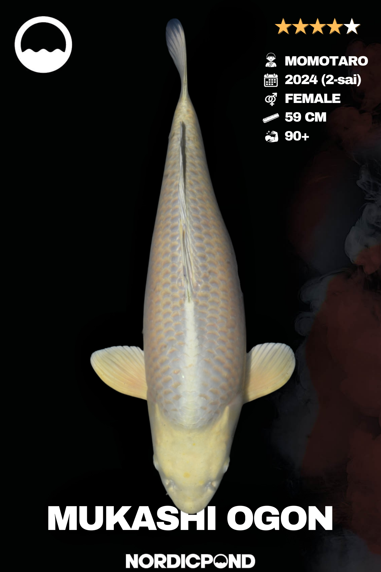 Dieser hochwertige Mukashi Ogon aus der bekannten Momotaro Koifarm in Japan gehört zu den besonders eleganten einfarbigen Metallic-Varietäten der Nishikigoi. Der Koi stammt aus dem Jahrgang 2024 (2-sai) und hat bereits eine beeindruckende Größe von 59 cm erreicht.