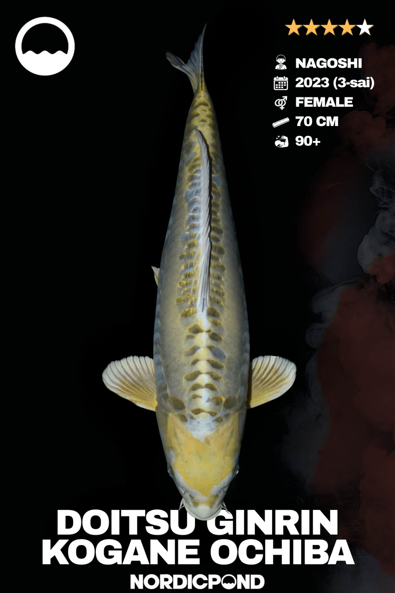 Außergewöhnlicher Doitsu Ginrin Kogane Ochiba mit starkem Ginrin-Glanz, klarer Rückenlinie und enormem Wachstumspotenzial. Junge Nagoshi-Qualität mit Perspektive bis über 90 cm.