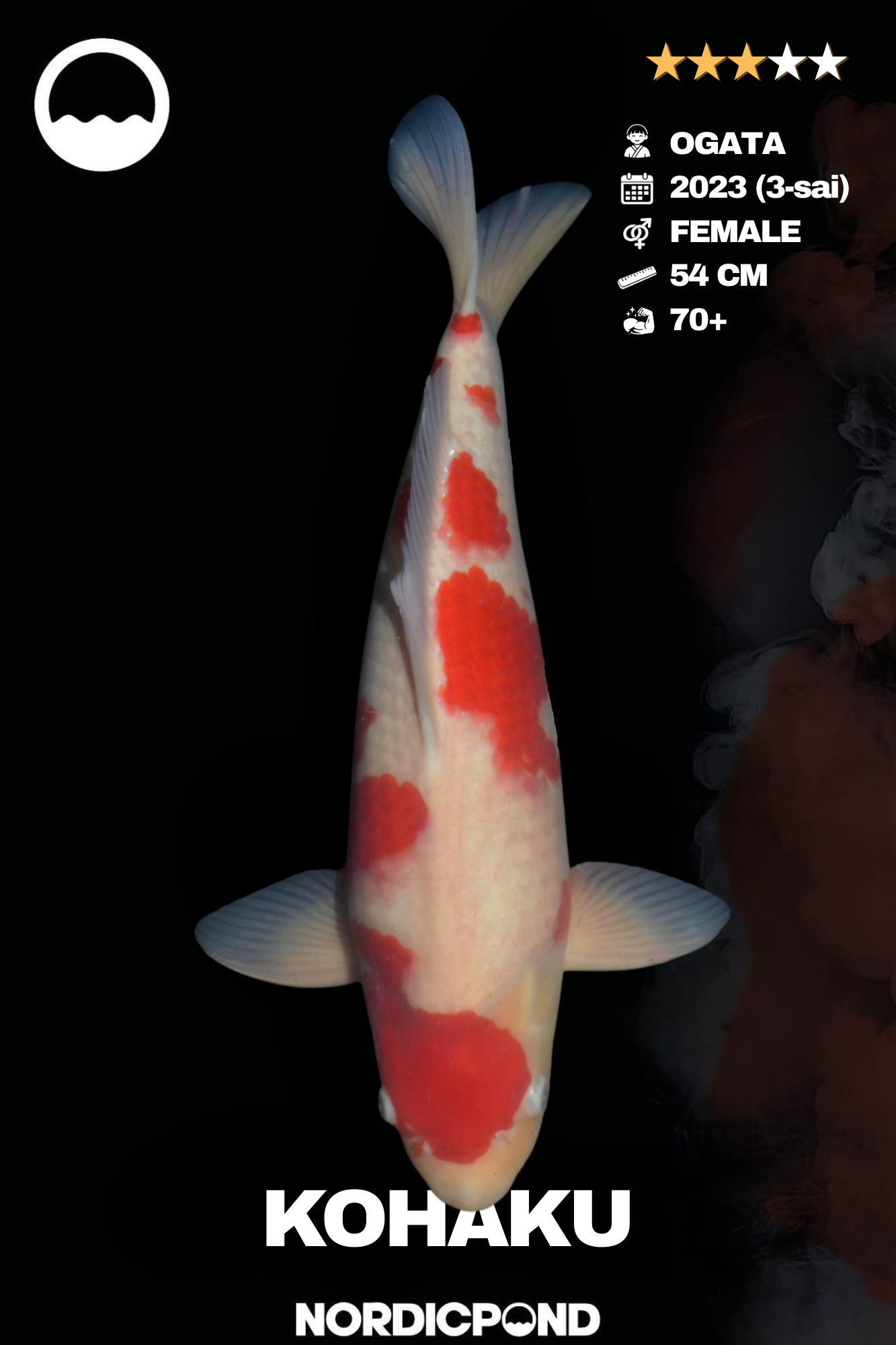 Klassischer Kohaku aus der renommierten Ogata Koifarm in Japan. Diese weibliche Koi-Dame aus dem Jahrgang 2023 misst aktuell 54 cm und überzeugt durch ihr kräftiges Hi und die klare Kohaku-Zeichnung.