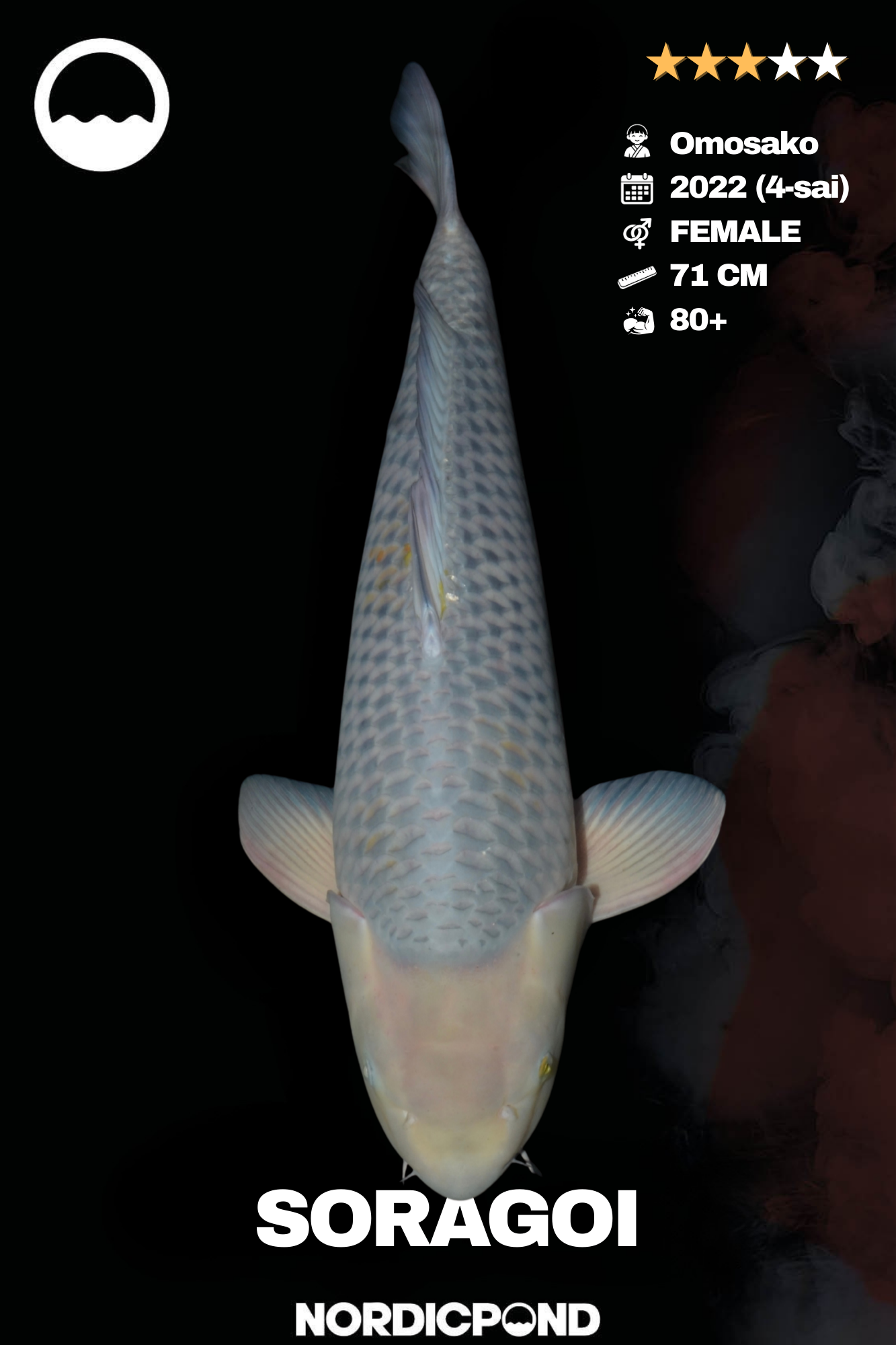 Die Omosako Koifarm ist international bekannt für hochwertige Zuchten mit stabiler Körperform und großem Wachstumspotenzial. Dieser Soragoi zeigt eine kräftige Schulterpartie, eine harmonische Körperlinie und sehr gute Volumenentwicklung, wodurch ein weiteres Wachstum in Richtung 80 cm+ realistisch ist.