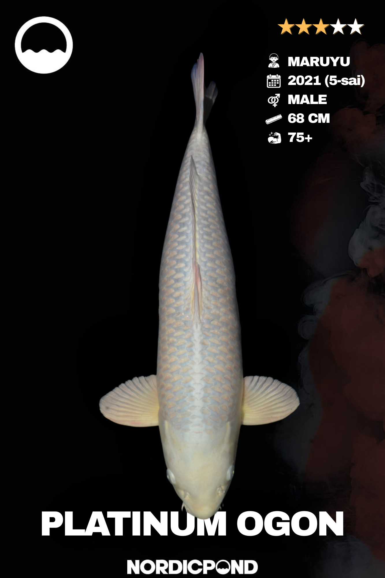 Eleganter Platinum Ogon aus der renommierten Maruyu Koifarm in Japan. Dieser männliche Koi aus dem Jahrgang 2021 misst aktuell 68 cm und überzeugt durch seinen intensiven metallischen Glanz.