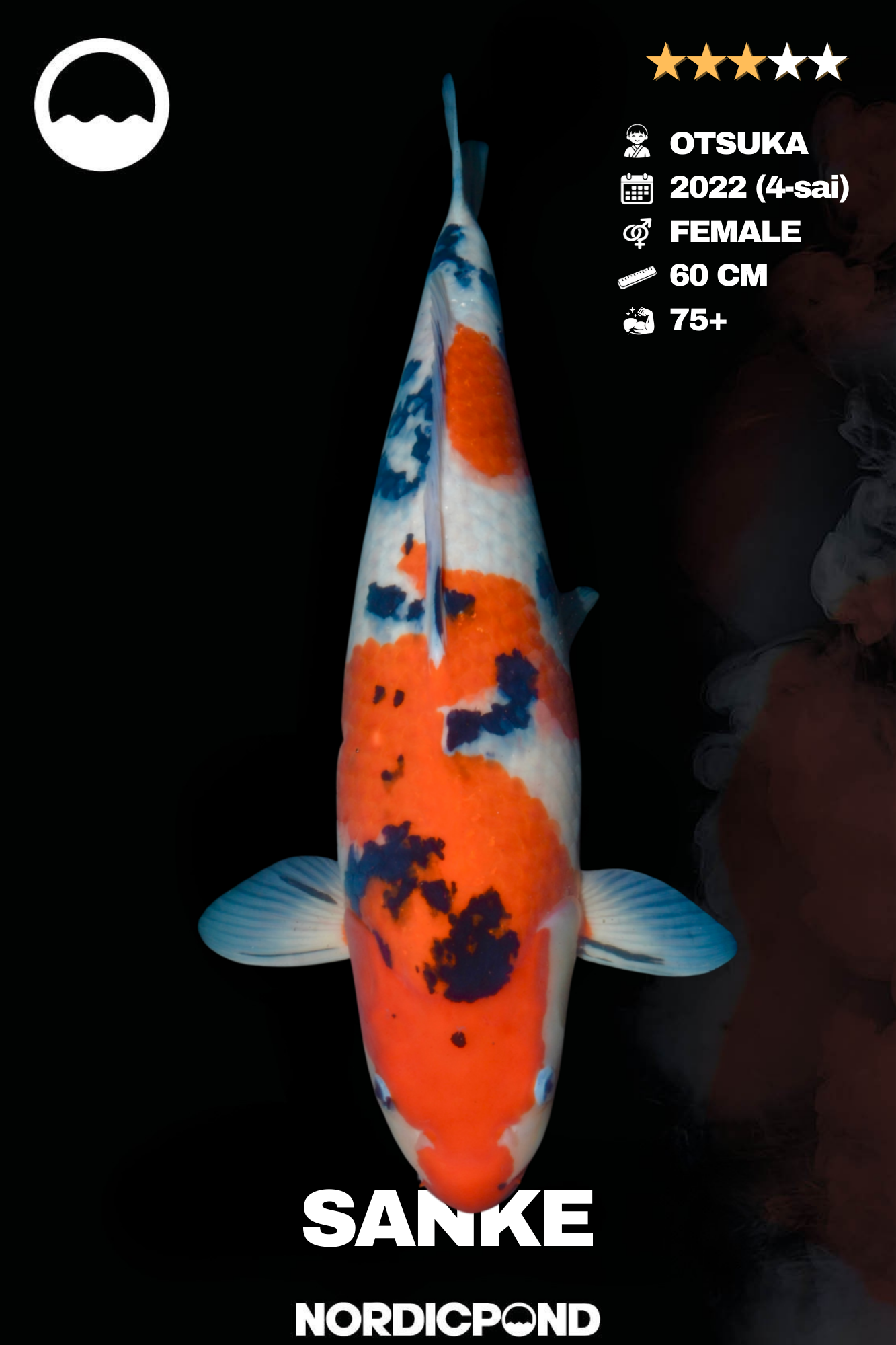 Sanke gehören zu den klassischen Hauptvarietäten (Gosanke) der Koi-Zucht. Charakteristisch ist die Kombination aus leuchtendem Beni (Rot), klarem Shiroji (Weiß) und kontrastreichem Sumi (Schwarz). Das schwarze Sumi erscheint dabei in einzelnen, markanten Flecken auf dem Körper und ergänzt das rote Muster auf elegante Weise.