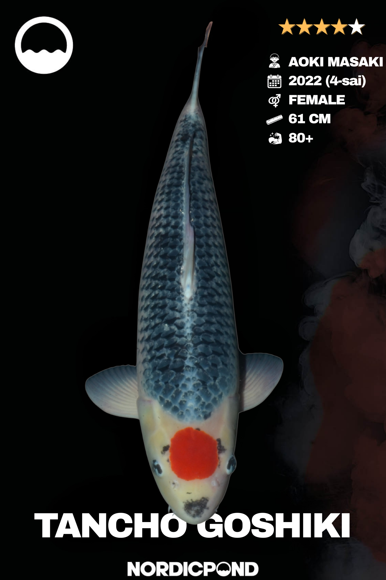 Eleganter Tancho Goshiki von der renommierten Aoki Masaki Koifarm aus Japan. Diese weibliche Nisai aus dem Jahrgang 2022 misst aktuell 61 cm und überzeugt durch den klassischen Tancho-Fleck in Kombination mit der charakteristischen dunklen Goshiki-Netzstruktur.
