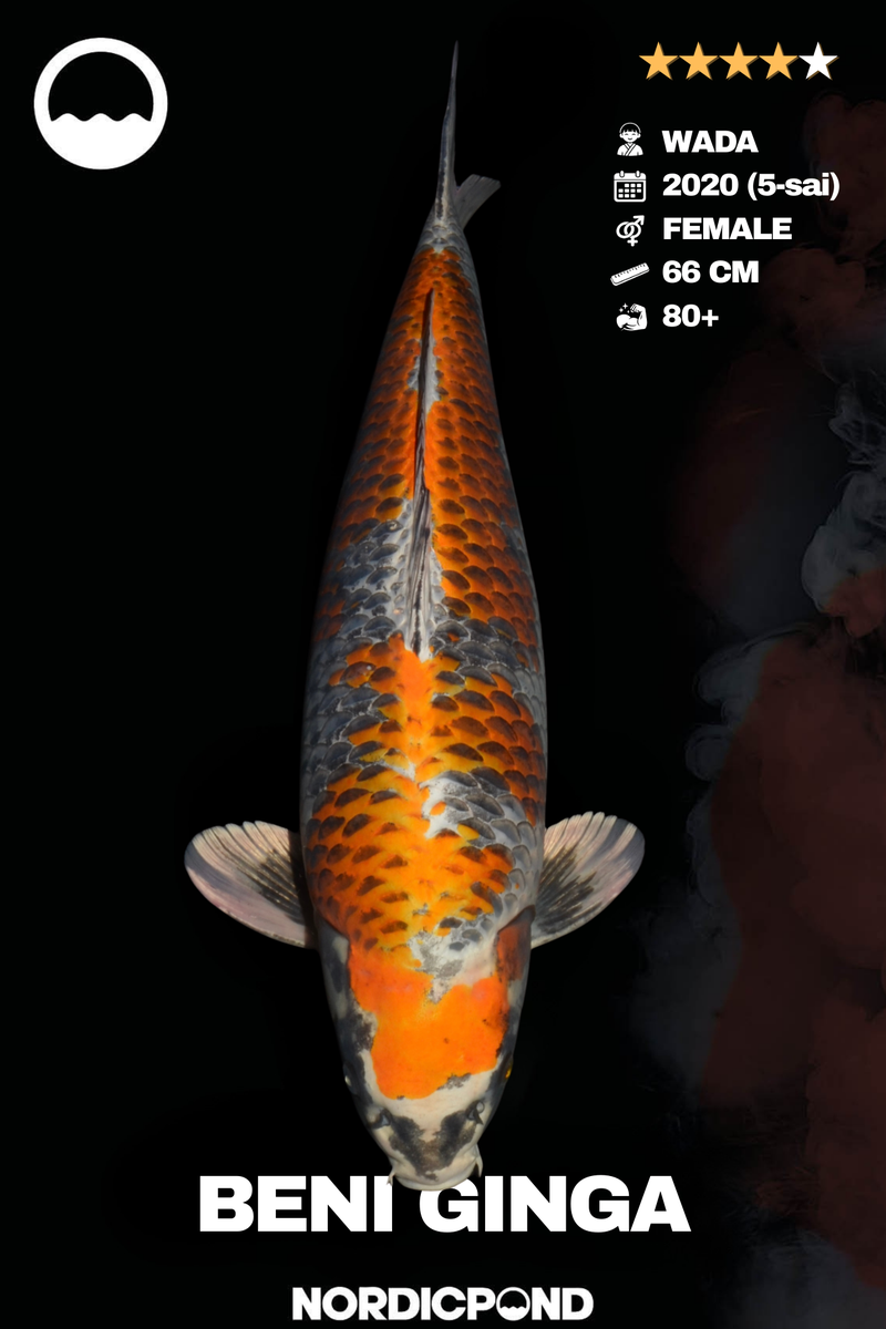 Mit einer Größe von ca. 66 cm (5-sai, Jahrgang 2020) zeigt diese weibliche Koi eine stabile, ausgewogene Körperform und ein ruhiges, souveränes Schwimmverhalten. Die gleichmäßige Schuppenstruktur und die klare Zeichnung unterstreichen die Qualität dieser japanischen Zucht.