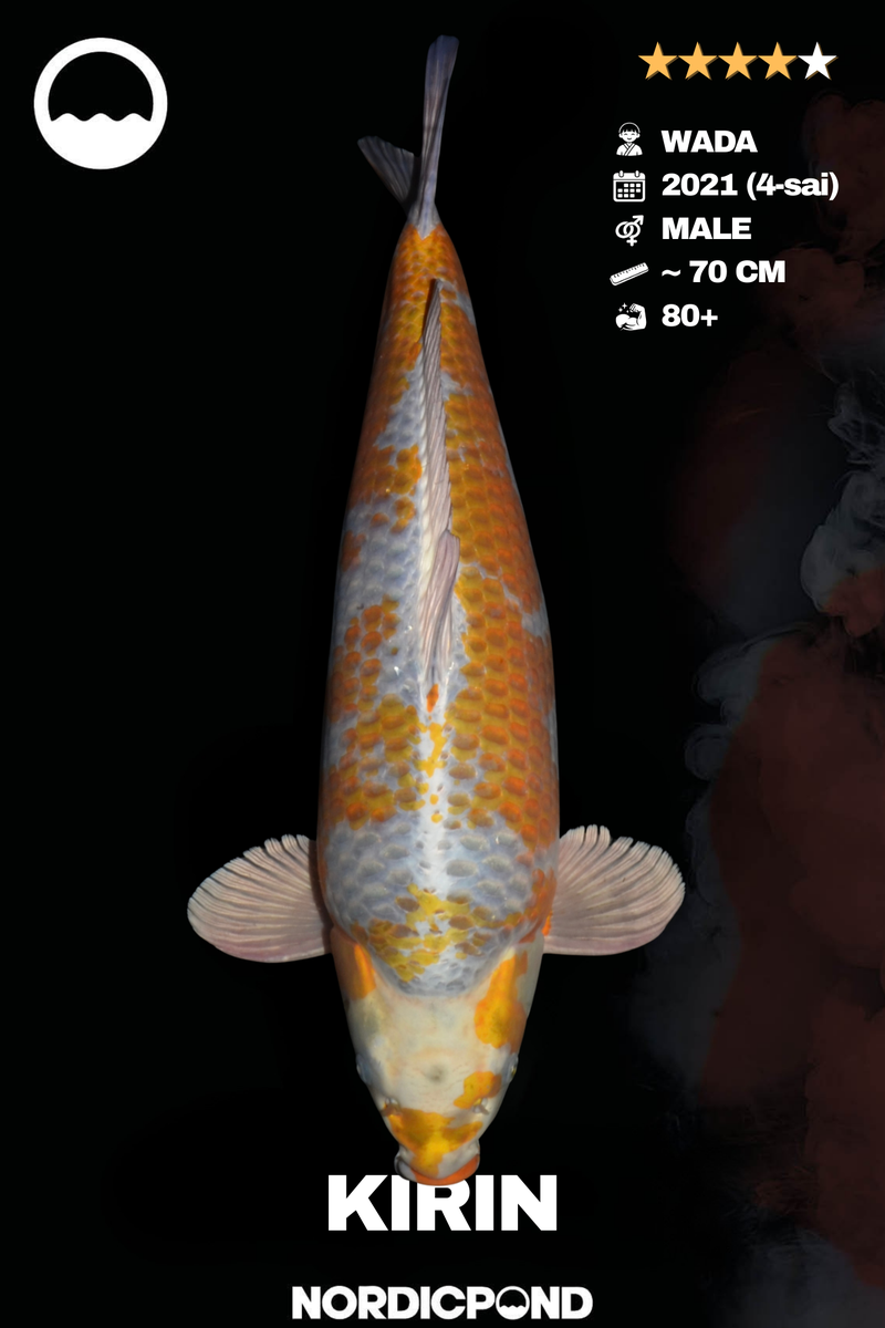 Dieser KIRIN Koi aus dem renommierten WADA-Koi Farm vereint Größe, Eleganz und Ausdrucksstärke auf höchstem Niveau. Die Kombination aus metallisch schimmernder Grundfarbe und unregelmäßig verteilten Hi-Akzenten verleiht diesem Tier eine besondere Tiefe und Dynamik.