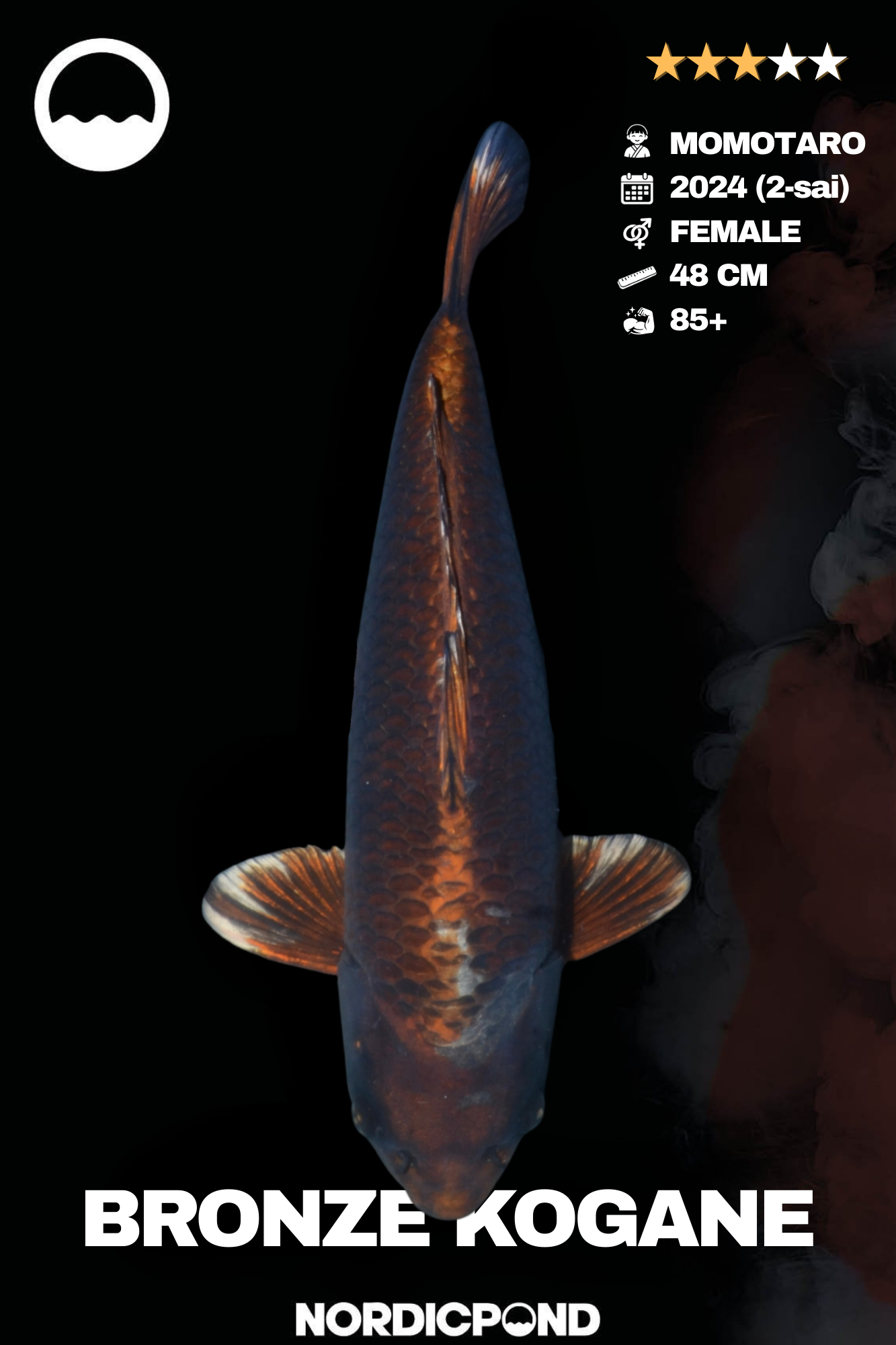 Dieser Bronze Kogane stammt aus dem Hause Momotaro und ist ein weiblicher 2-sai aus dem Jahr 2024 mit einer Länge von ca. 48 cm. Der Koi zeigt eine gleichmäßige Bronze-Farbwirkung mit ruhigem Erscheinungsbild und klarer Linienführung. Die Körperform wirkt ausgewogen und stabil. Der Fisch eignet sich gut für Koihalter, die einen einfarbigen Koi mit ruhiger Ausstrahlung und solider Grundqualität suchen.