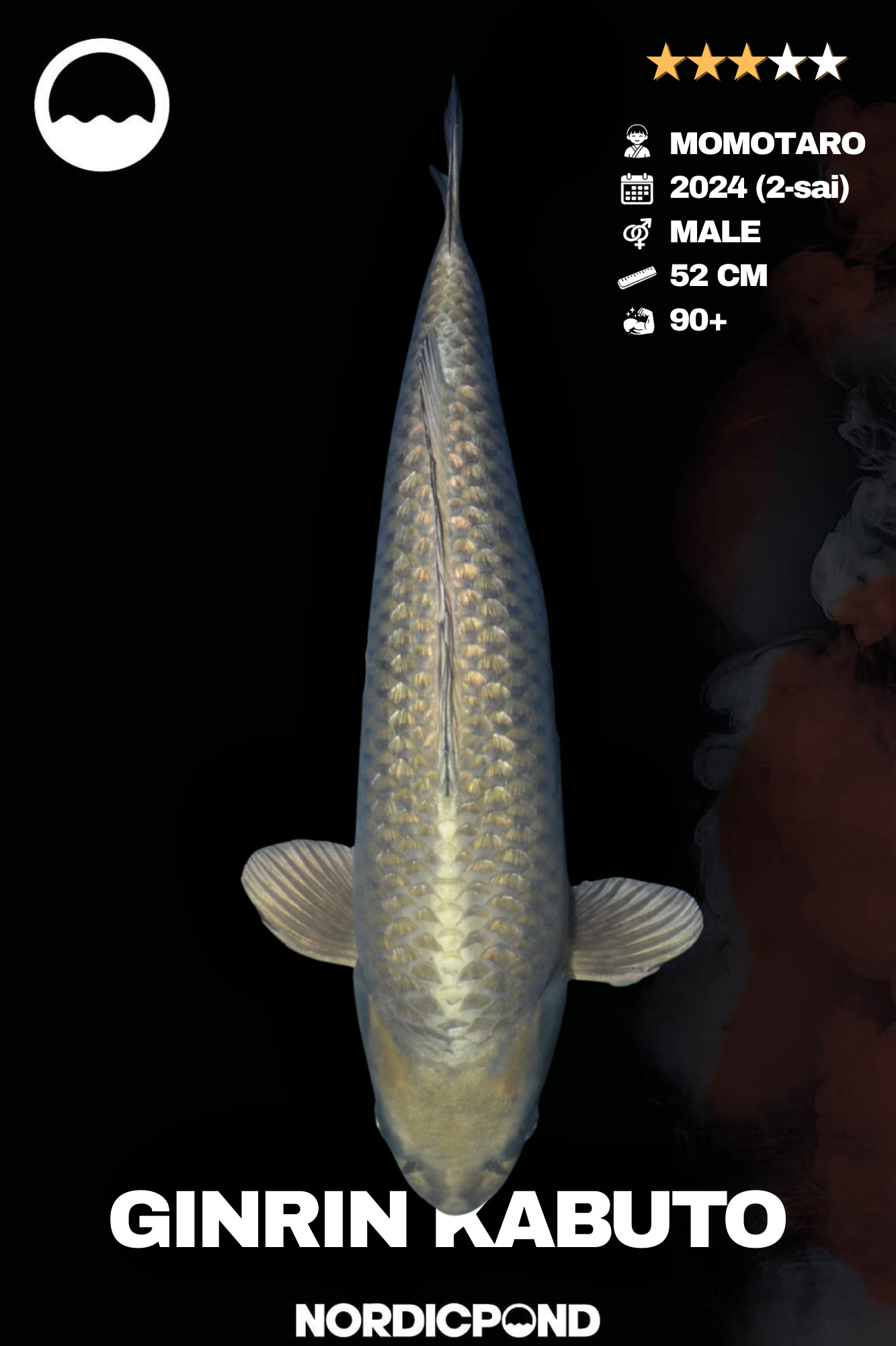 Dieser Ginrin Kabuto ist ein männlicher 2-sai aus dem Jahr 2024 mit einer Länge von ca. 52 cm. Der Ginrin-Glanz ist deutlich und gleichmäßig ausgeprägt. Die Körperlinie wirkt klar und gut proportioniert. Der Koi präsentiert sich ruhig und strukturiert und eignet sich gut für Koihalter, die Wert auf Glanz und klare Formen legen.