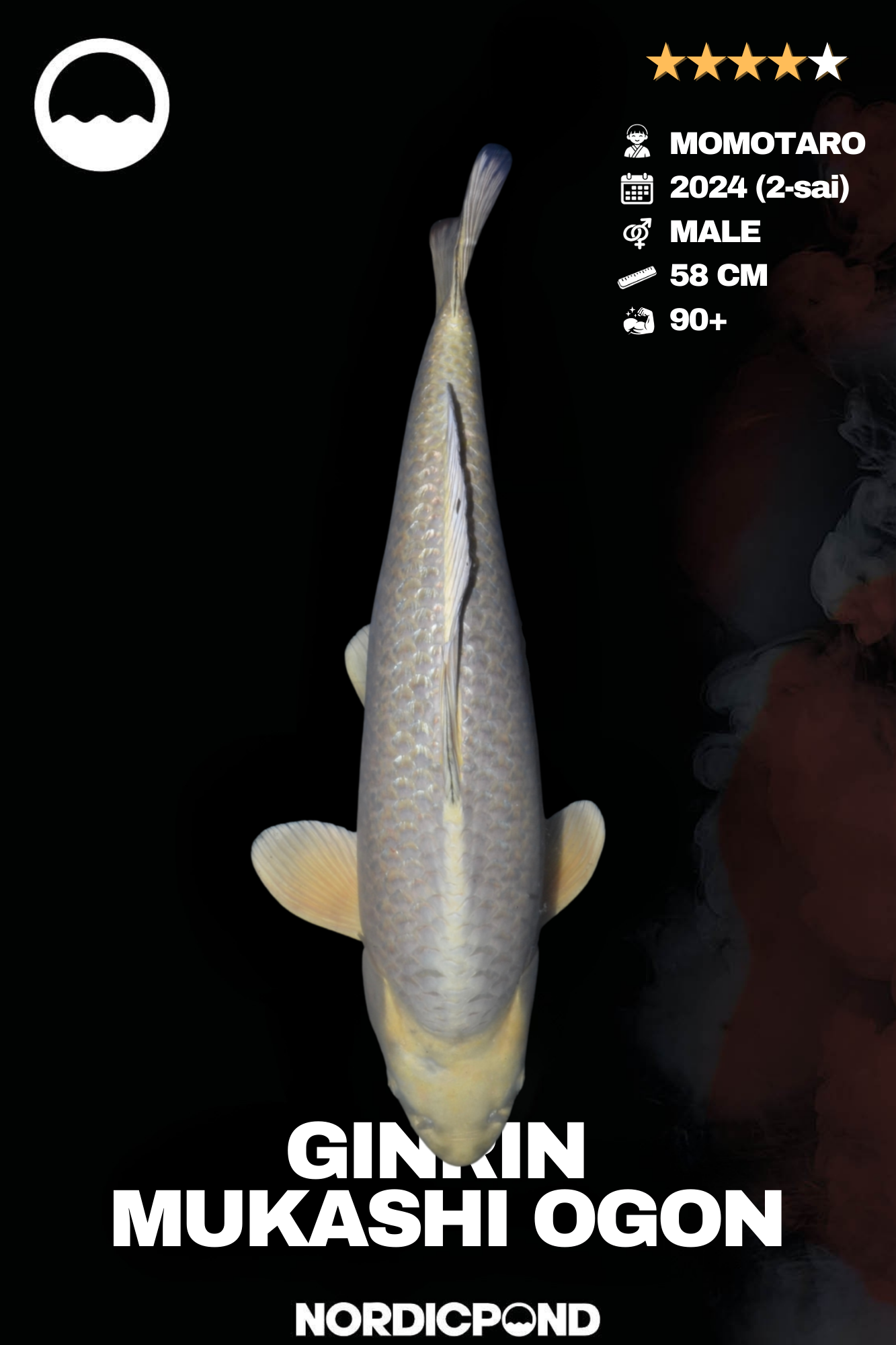 Ginrin Mukashi Ogon von Momotaro, Male, 2-sai (2024), ca. 58 cm. Gleichmäßiger Ginrin-Glanz und ruhige Farbwirkung.