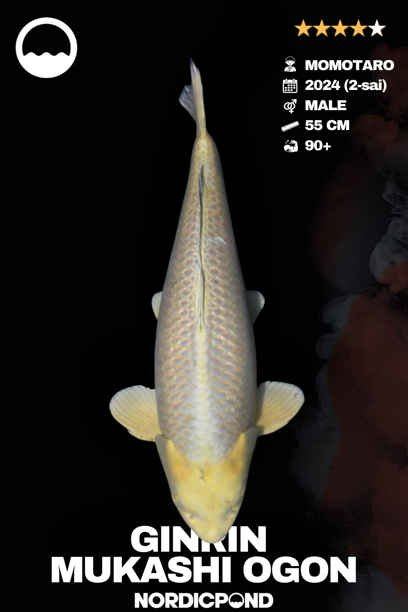 Dieser Ginrin Mukashi Ogon ist ein männlicher 2-sai aus dem Jahr 2024 mit ca. 55 cm Länge. Der Koi zeigt einen gleichmäßigen Ginrin-Glanz und eine ruhige Grundfarbe. Die Körperform ist klar und ausgeglichen. Ein sachlich gut einzuordnender Ogon für unterschiedliche Erfahrungsstufen.