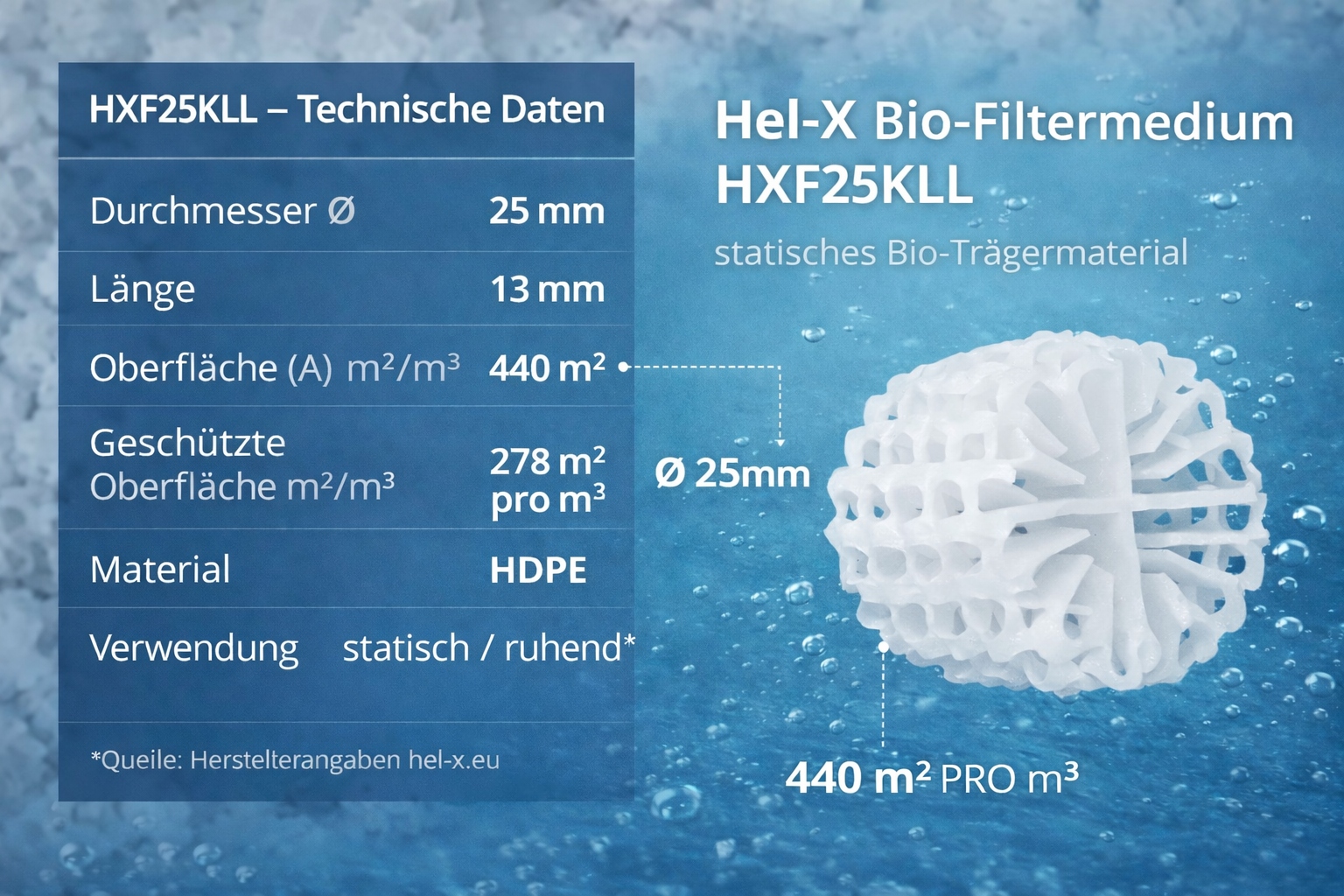 Der HXF KLL 25 weiß ist ein hochwertiger Hel-X Bioträger für den statischen Einsatz in biologischen Filtersystemen. Es handelt sich um die leistungsstärkere HXF-Variante mit erhöhter Biofläche im Vergleich zu herkömmlichen KLL-Medien.